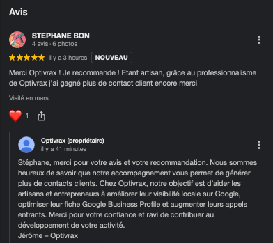 Optivrax.com a transformé notre présence en ligne ! Nous étions perdus dans le monde du SEO et de l'optimisation, mais l'équipe d' optivrax nous a guidés avec expertise et patience. Non seulement notre fiche Google My Business a grimpé dans les classements, mais nous avons également observé une augmentation significative des 3 de devis et des visites clients. Leur garantie 'pas de résultats, pas de paiement' prouve à quel point ils sont confiants et efficaces. Merci, Optivrax.com !"